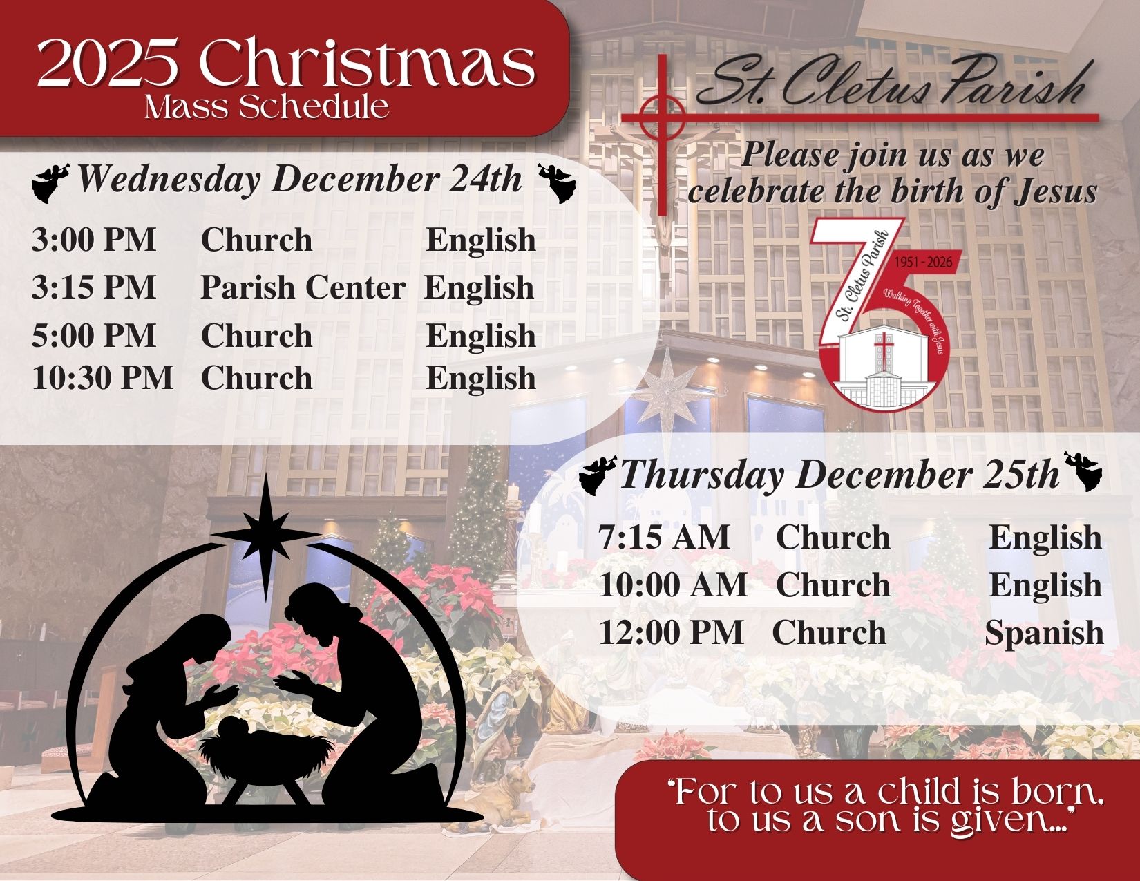 St. Cletus Parish is committed to providing spiritual nourishment through the worship of God, celebration of the sacraments, Catholic education, and use of our time, talent and treasure in serving others with compassion and love.